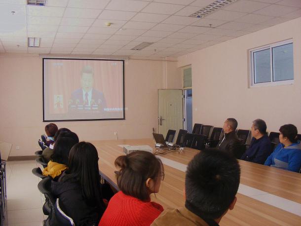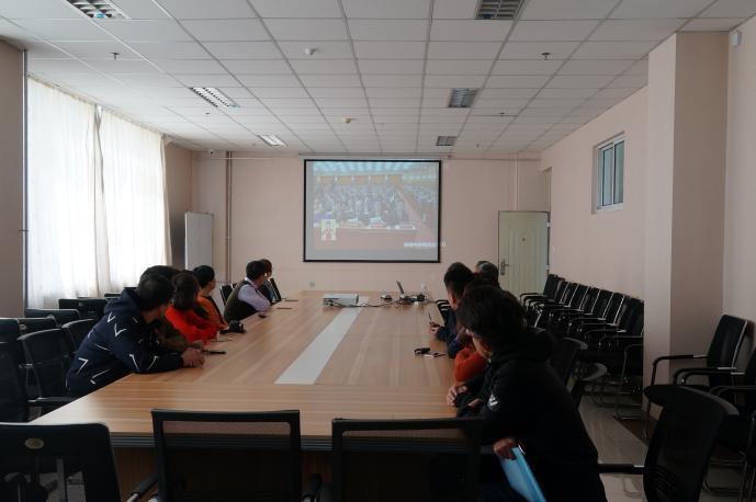 会议室观看开幕式实况。全体师生党员认真听取并学习中共中央总书记习近平作的工作报告。