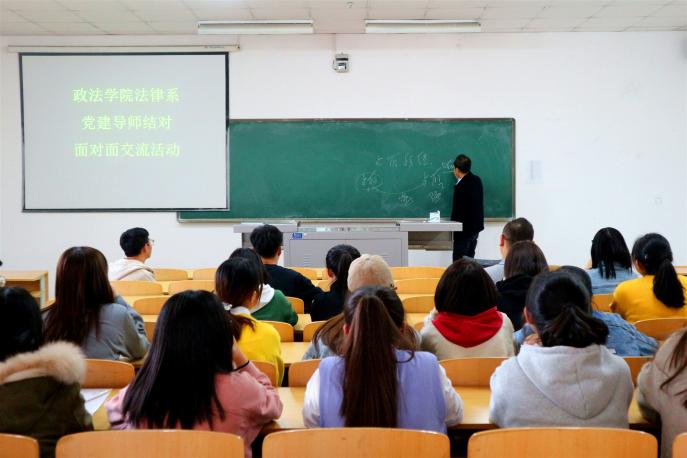 10月30日,法律系开展党建导师制师生见面活动,胡世恩副院长、系主任张弛和戴新毅、张驰、左海军、何磊、段向坤、滕明荣、张存明、王澍宜、江兆涛、朱爱农、杨国举、朱蓓予、许宝贵、卢烨、王丽婷、刘淑媛、马卫军、曹慈义、白利萍等教师党员分别在文荟103、105、109、111四个教室与自己所联系的党员学生和2019级新生相互见面,就如何充实大学生活学习、快速适应法学专业学习等问题与学生党员和2019级新生开展指导交流。各位党员教师对2019级新生的到来表示欢迎;随后,对热点社会现象法律知识、如何学好专业知识、如何更好地规划人生等问题作了详尽解答,并对同学们提出了殷切期望。