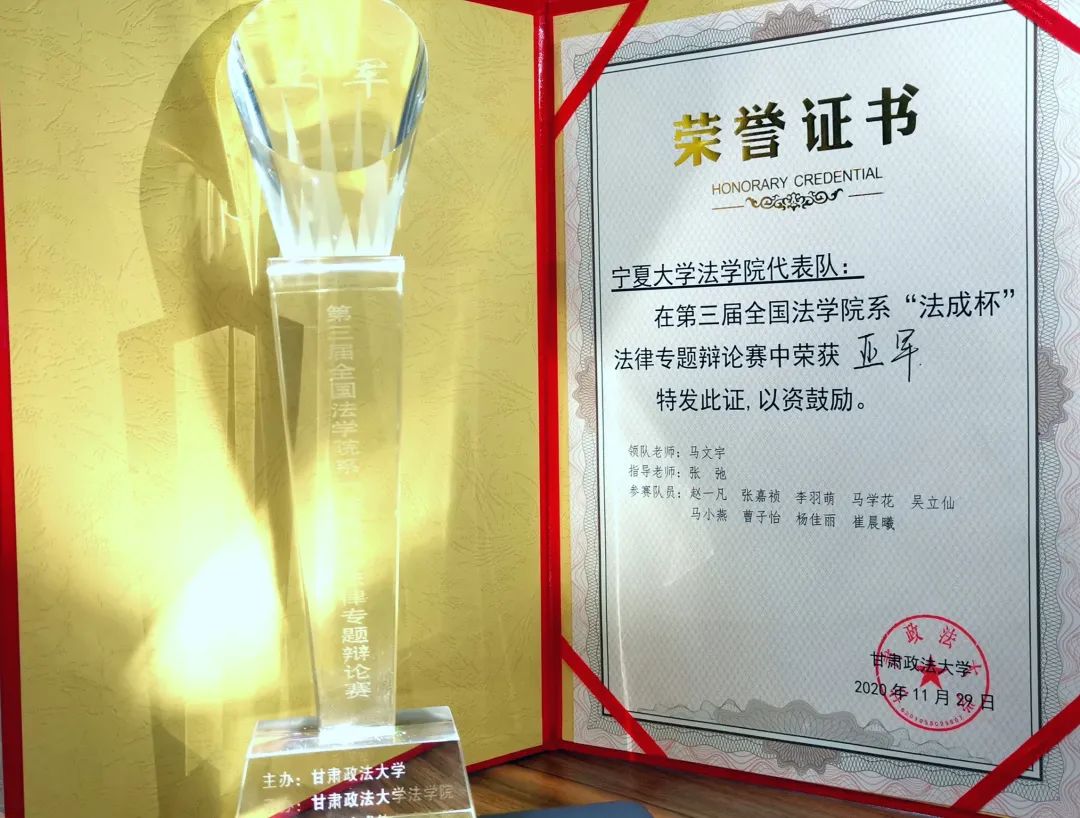 受邀参赛并荣获亚军、最佳风范奖,赛队教练、法律系主任张弛荣获优秀指导老师称号,法学专业2018级本科生张嘉祯、赵一凡荣获最佳辩手称号。