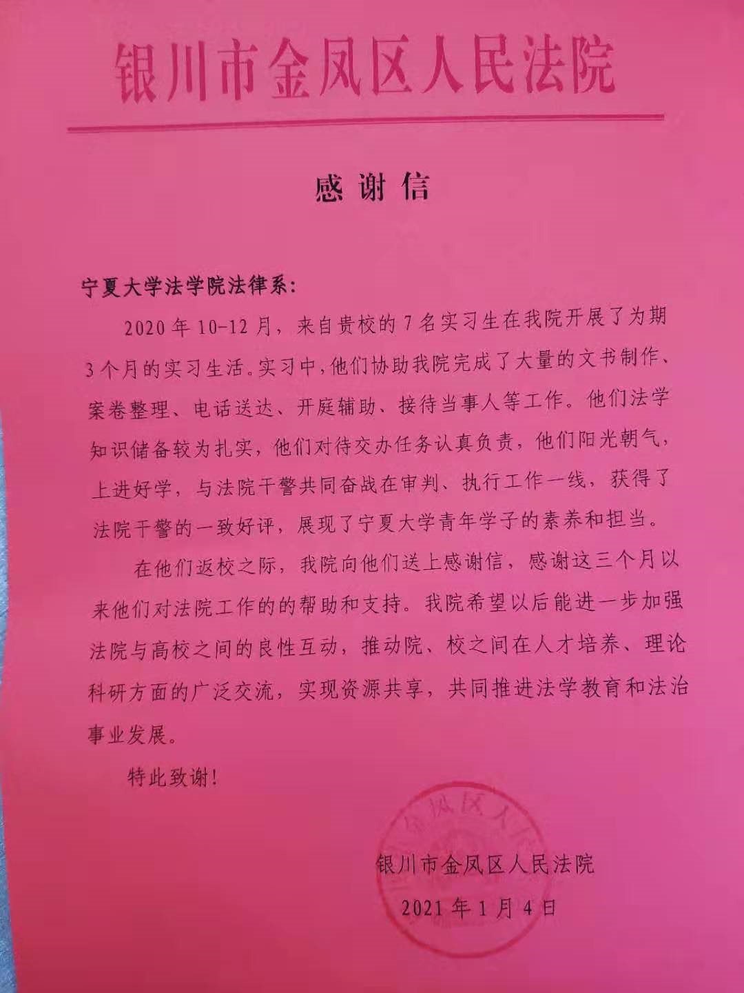 的实习安排以及金凤区人民法院提供的实习平台与实习机会表示感谢。