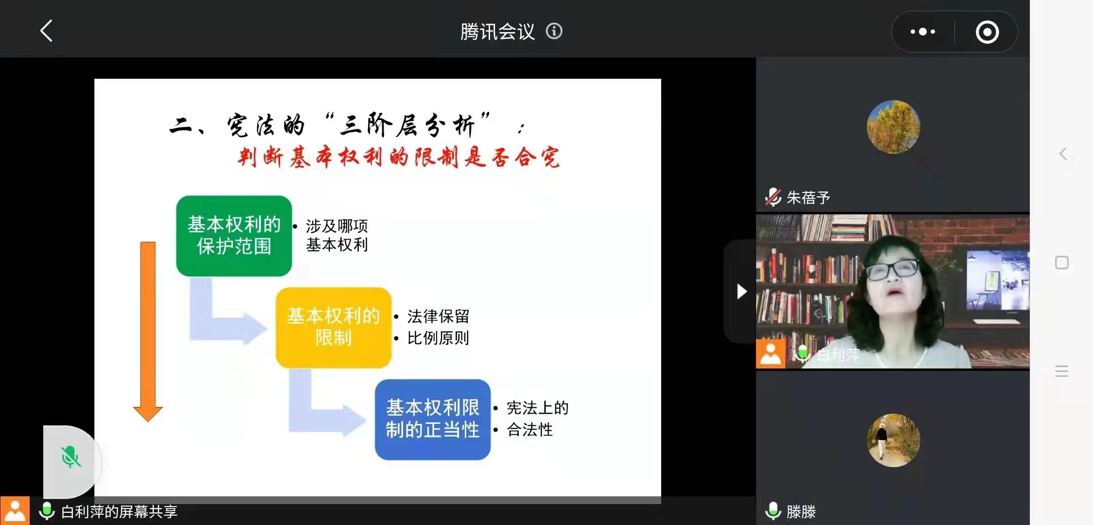 宪法日主题活动作了题为“鉴定式:宪法基本权利案(事)例研习”的专题讲座;专任教师都参加了教育部主办的马工程《宪法学》第二版专题培训以及相关课程思政教学能力培训,宪法与行政法教研室老师共同学习和研讨了教育部发布的《宪法学教学重点指南》,形成共识,为《宪法学》课程思政建设集思广益,形成创新思路。