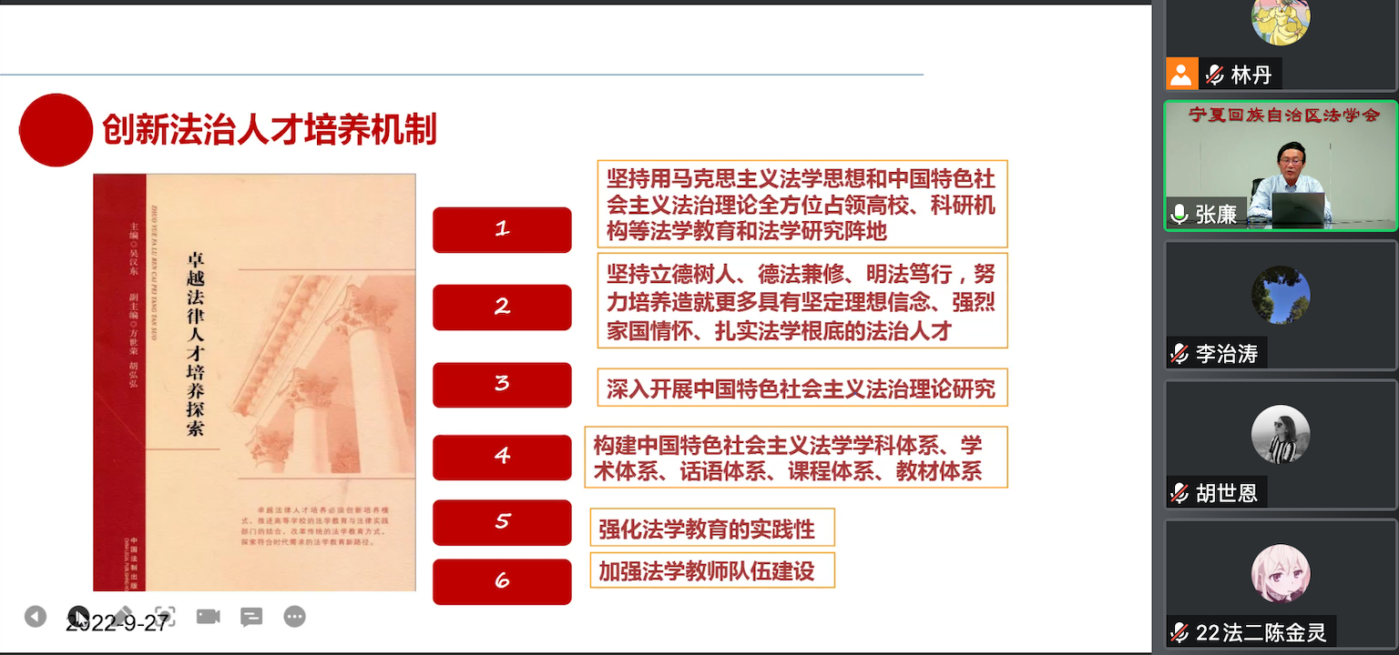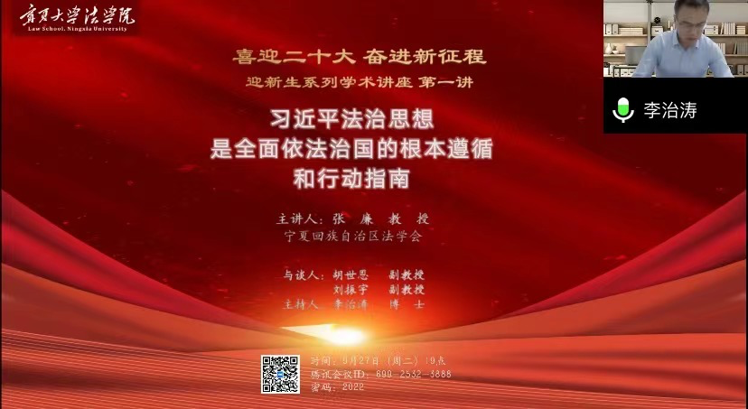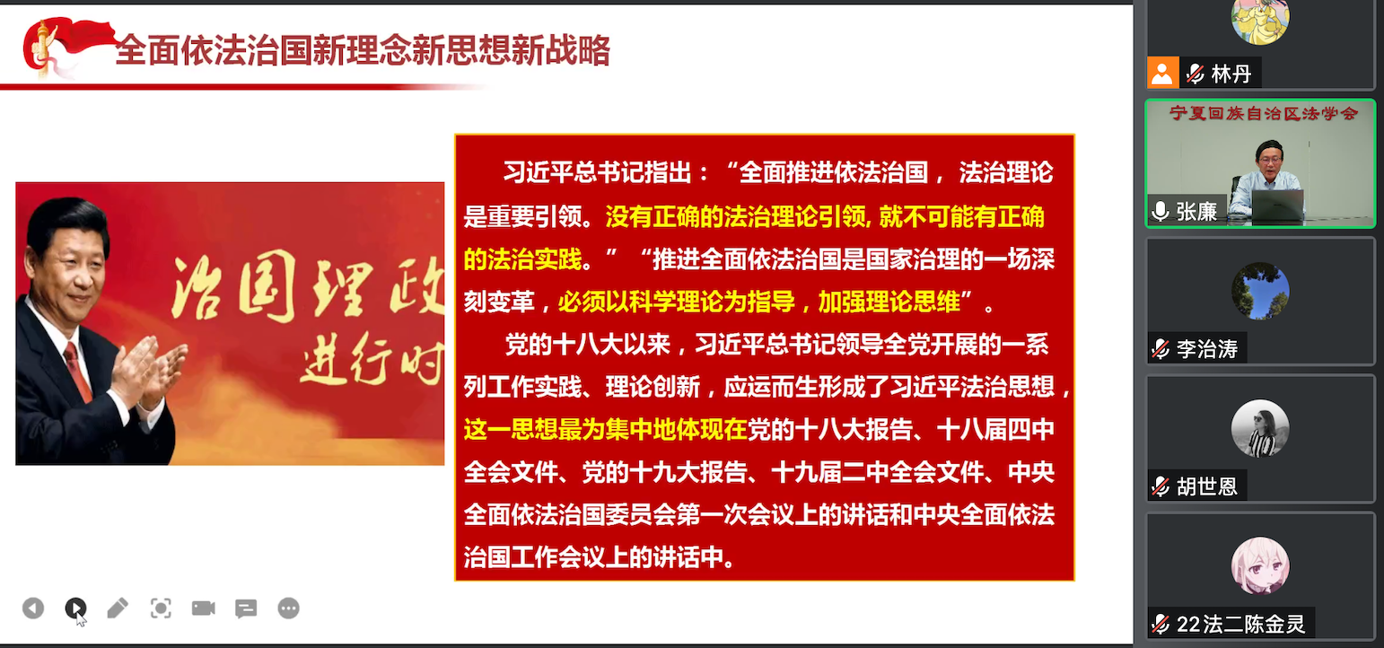 迎新生系列学术讲座精彩开讲,特邀宁夏回族自治区法学会党组书记、常务副会长张廉教授为全院师生带来首场题为《习近平法治思想是全面依法治国的根本遵循和行动指南》的线上讲座,深入解读习近平法治思想的重大意义、丰富内涵、科学方法