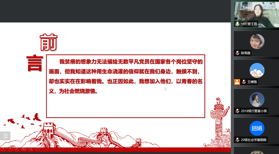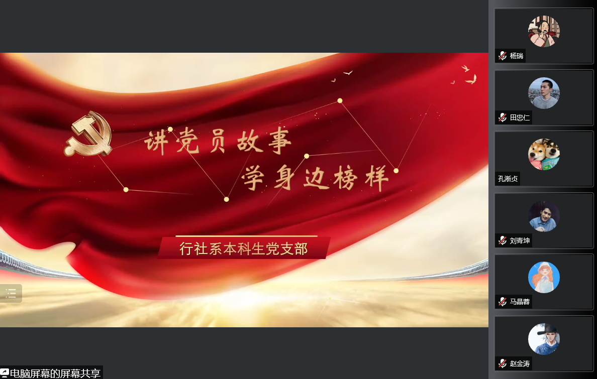 党委的相关要求,11月10日晚,行社系本科生党支部组织召开了发展对象考核汇报会“讲述身边党员的故事”暨线上群众座谈会。党支部书记武玲娥、支部全体党员、支部第十四期发展对象参加此次会议。会议由支部宣传委员陈雪薇主持。
