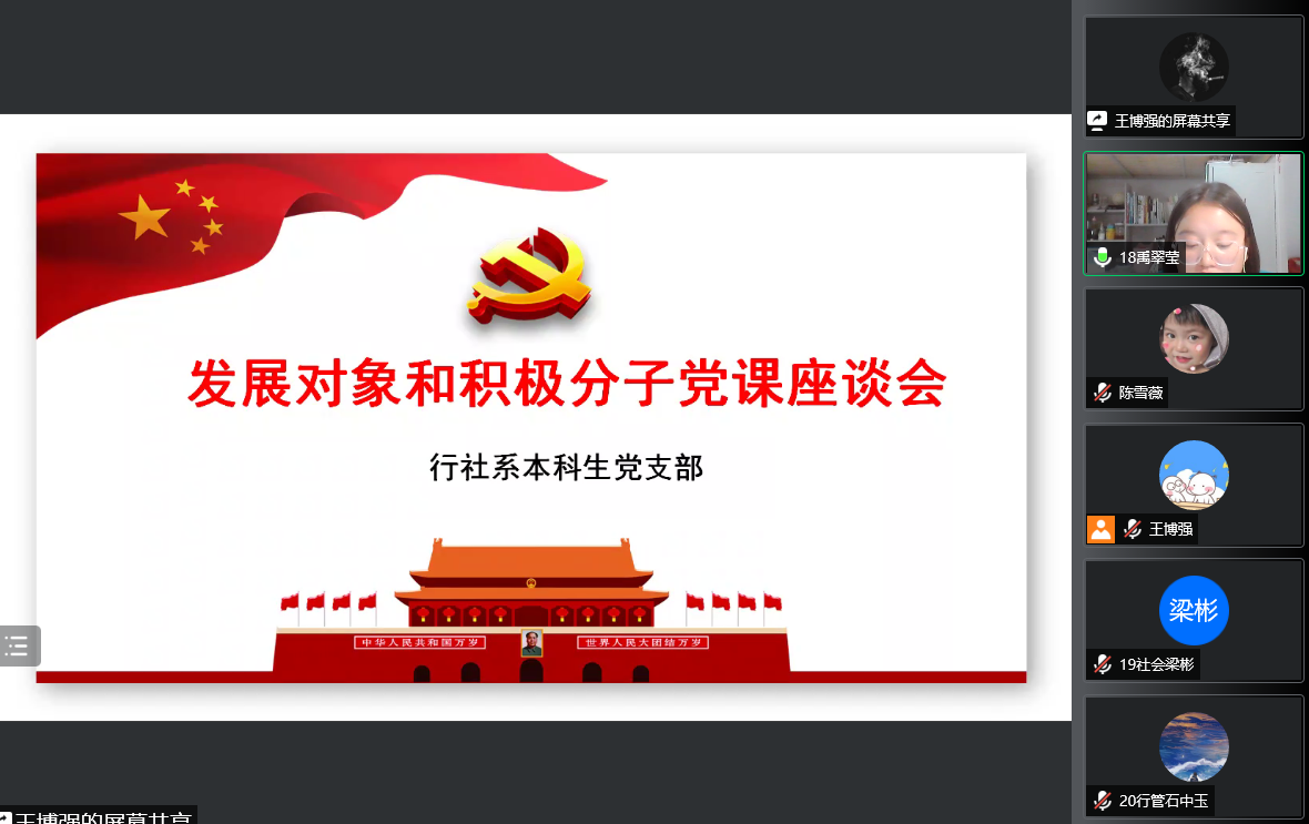 业余党校课程安排,10月27日晚上,行政管理与社会学系本科生党支部召开线上座谈会。支部书记武玲娥、支部支委,支部第十四期发展对象、第三十九期积极分子参加会议。此次座谈会由支部组织委员王博强主持。
