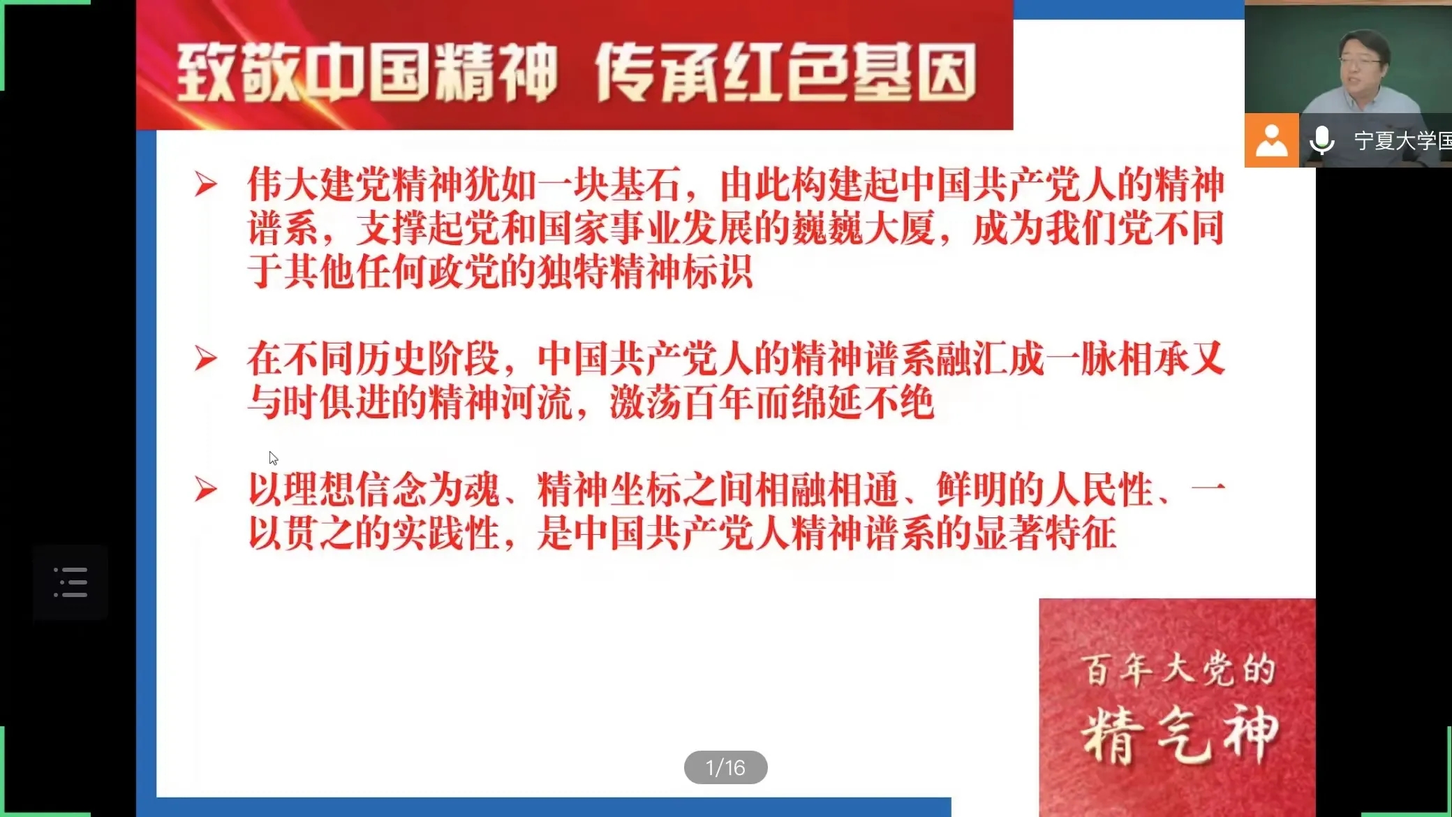 会议伊始,张弛提出,中国共产党人的精神谱系,是一个同根同源的庞大价值系统和结构整体,反映了百年党史的主题主线、主流本质,为实现中华民族伟大复兴提供了强大精神动力。接着,他从新民主主义革命时期,社会主义革命和建设时期,改革开放和社会主义现代化建设新时期和中国特色社会主义新时代四个阶段分别阐释了各阶段的中国精神。重点阐释了具有代表性的伟大长征精神、雷锋精神、改革开放精神和脱贫攻坚精神等。之后,张弛以举例子、讲道理的方式阐述了“久久为功,三北精神”。他提到,伟大人民铸就伟大精神,伟大精神成就伟大事业。最后,张弛呼吁各位学员赓续精神谱系,担当强国责任。