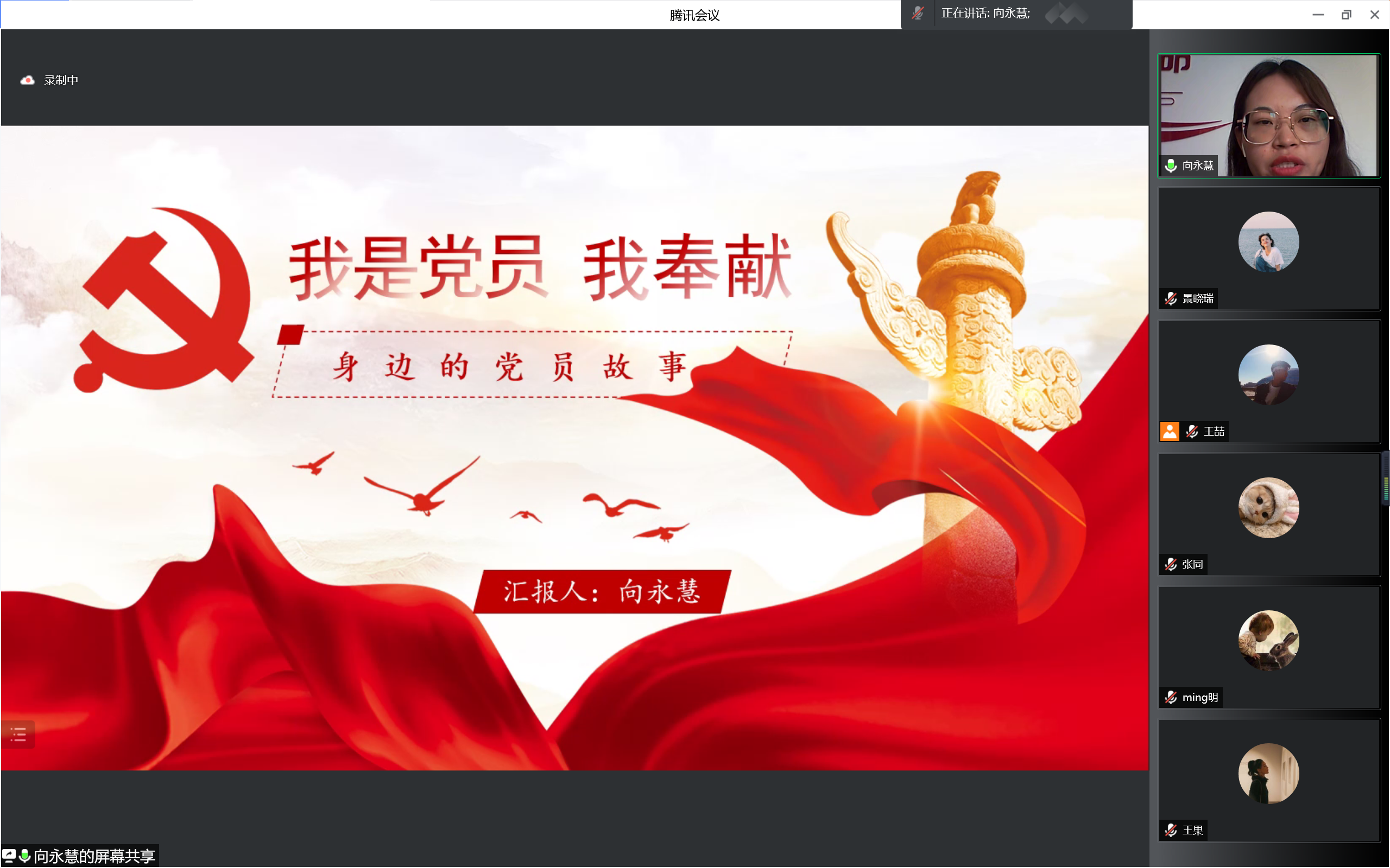 学生处综合科曹楠同志的事迹,他对工作认真的态度深深打动与会同志;2020级李雪玉讲述了毛洪亮同志的事迹,他创建的干部“一助扶贫帮困活动”被全生产建设兵团推广,多次被评为“优秀党员”;2020级郝琦讲述了赵志范同志如何做一个既伟大又平凡的人;2021级王果讲述了西吉县龙王坝村副书记焦建鹏作为一名农村致富带头人的故事。一个个生动的故事使与会同志深受感动的同时,也更加坚定了自己的理想信念,在榜样的鼓舞下,立志从小事做起,从身边事做起,用自己的行动积极向党组织靠拢,争取早日成为一名光荣的共产党员。