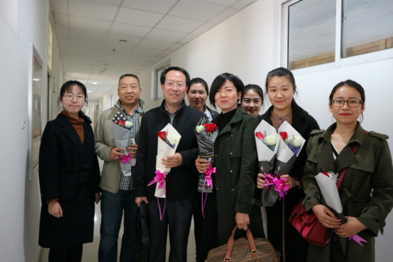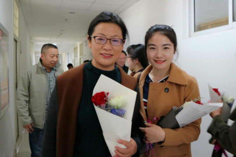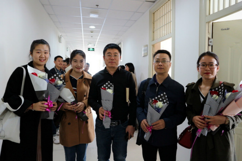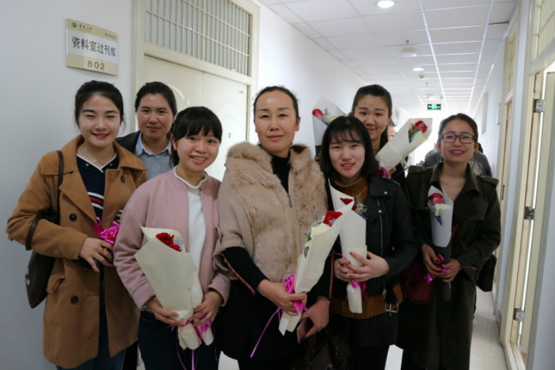 学生党员代表在文荟楼八楼会议室积极开展“鲜花赠恩师,欢庆三八节”活动。