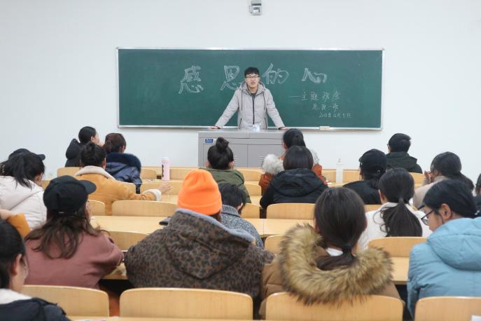 从获得2018年国家奖学金、国家励志奖学金、以及感恩中国近现代科学家奖助学金中遴选了较突出的学生分别在各班分享自己在学习、竞赛、科技创新、回报社会等方面的经历及取得的成绩,如2016级思政专业包道广作为感恩中国近现代科学家奖学金的获得者,前不久刚刚获得共青团中央“强国一代新青年称号”,他的励志故事深深鼓舞着所有的同学。
