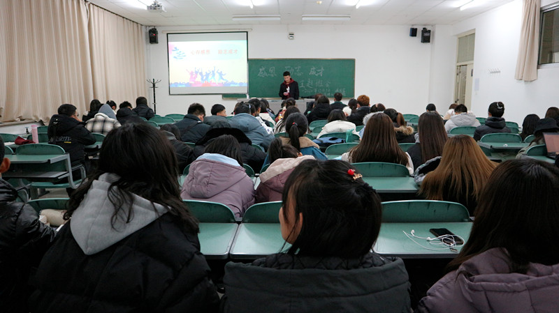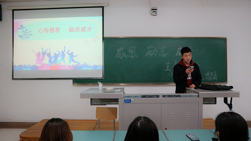 各班紧紧围绕着“感恩、励志、成才”的主题,从感恩故事、感恩节日、感恩诗歌三方面进行深入学习。班长通过分享感恩故事,让同学们了解到感恩有利于我们保持良好的心态,并能够以积极的态度投入到日后的学习和生活中。接着,班长提出“我们是否应该去无休止的抱怨生活?”的问题,同学们围绕问题积极发言,分享自己的看法与体会。班会的最后,通过放映关于感恩的视频,希望同学们能够在日后的生活中能少些抱怨、多些感恩。