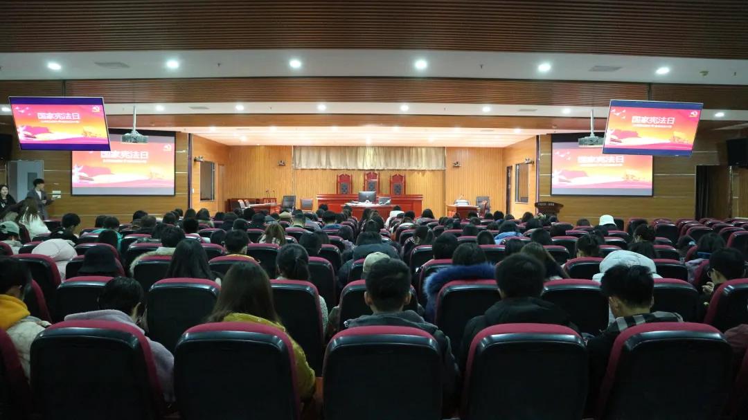 于12月4日晚七点在文荟楼模拟法庭举办了国家宪法日普法知识讲座活动。由来自2018级法学专业的李后龙、徐绍宇和谭旺三位同学为大家进行宣讲,全体2020级本科生到场聆听。