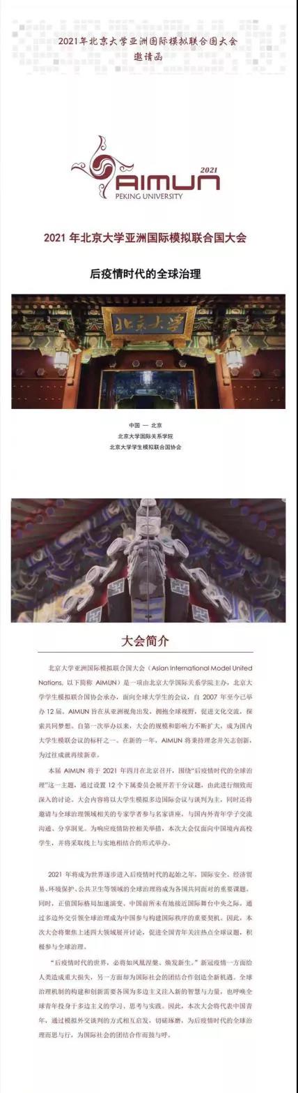主办的2021年北京大学亚洲国际模拟联合国大会。本届大会围绕“后疫情时代的全球治理”这一主题,旨在从亚洲视角出发,拥抱全球视野,促进文化交流,探索共同梦想。