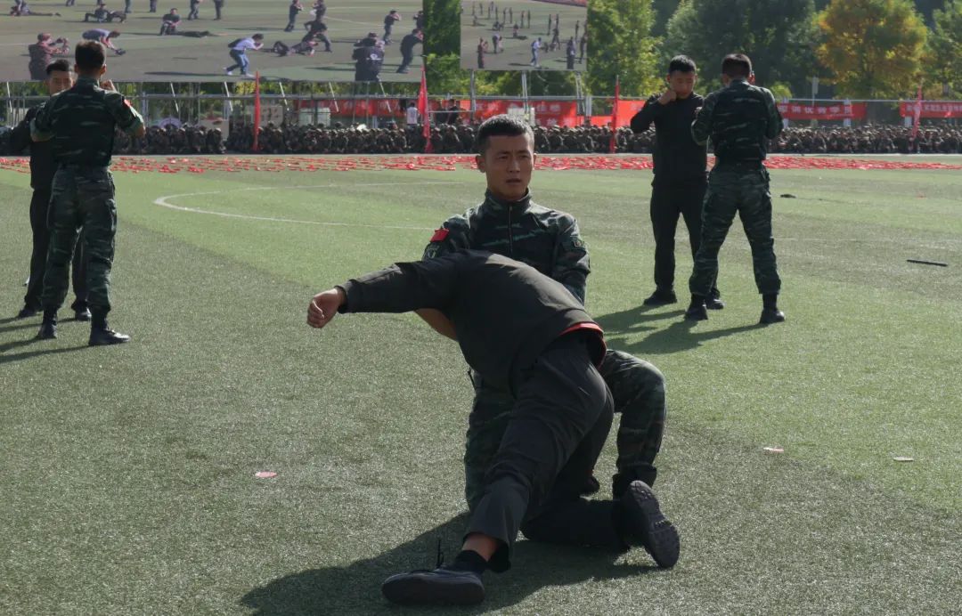 首先,校领导检阅参训方阵,各方阵喊话:“书记好!”“为校争光!”标兵就位后,各营连以分列式方阵走过主席台,步履矫健、整齐划一的队列方阵展现了青春学子的昂扬斗志;至此,本次军事展演正式开始。刺杀操方阵、擒敌拳方阵、防暴队、持枪战术方阵、匕首操方阵纷纷亮相。随后,教官制暴术表演、音乐赌场老虎机攻略