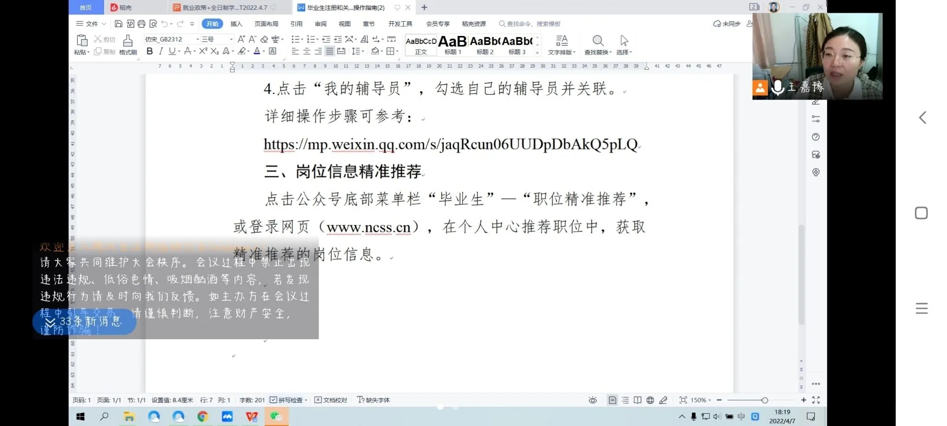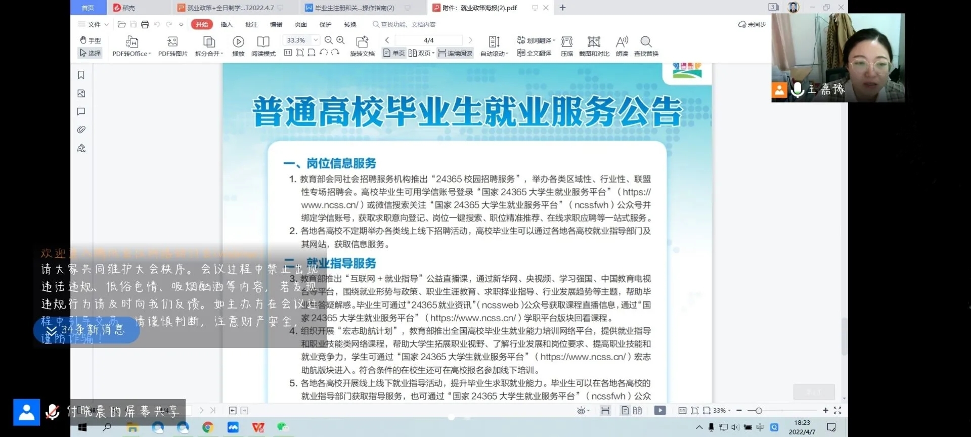 面向2022届毕业生开展以“2022年高校毕业生就业创业政策宣讲”为主题的宣讲会。会议由学生工作办公室主任王嘉豫主持,采用腾讯会议的形式召开,全体2022届毕业生参会。