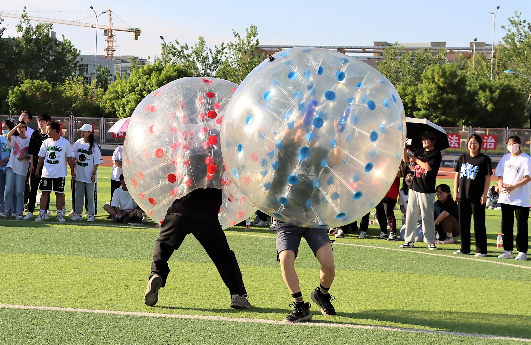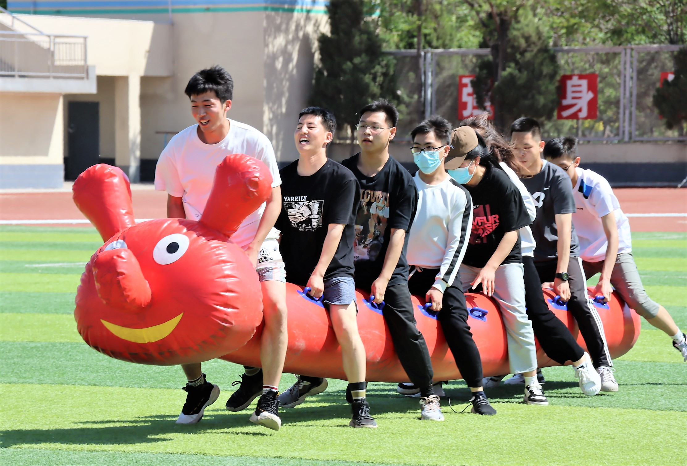 五月初,夏日的骄阳已初显头角,但炎炎烈日难挡学生们洋溢的青春和火热的激情。本次趣味运动会设有八人多足毛毛虫、滚铁环、跳大绳、不倒杆、碰碰球等多个项目,活动现场气氛热烈,既有技巧与能力的竞争,又有团队合作精神和默契程度的考验。“不倒杆”项目考验着选手们的技巧与耐心,是团队合作和个人能力的巨大挑战;堪称童年回忆的“滚铁环”项目,小小的铁环难倒了好多同学;碰碰球项目更是激起一阵欢声笑语,选手们穿戴好碰碰球和护膝等保护设备,在草坪上激烈碰撞着,稍不留意就被撞得人仰马翻。观众们的视线都被赛场情况所牵动,现场的欢笑声、喝彩声此起彼伏。