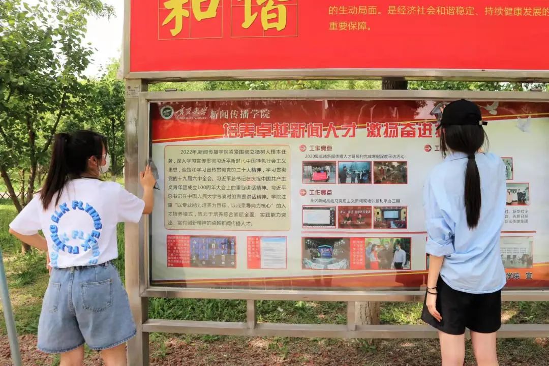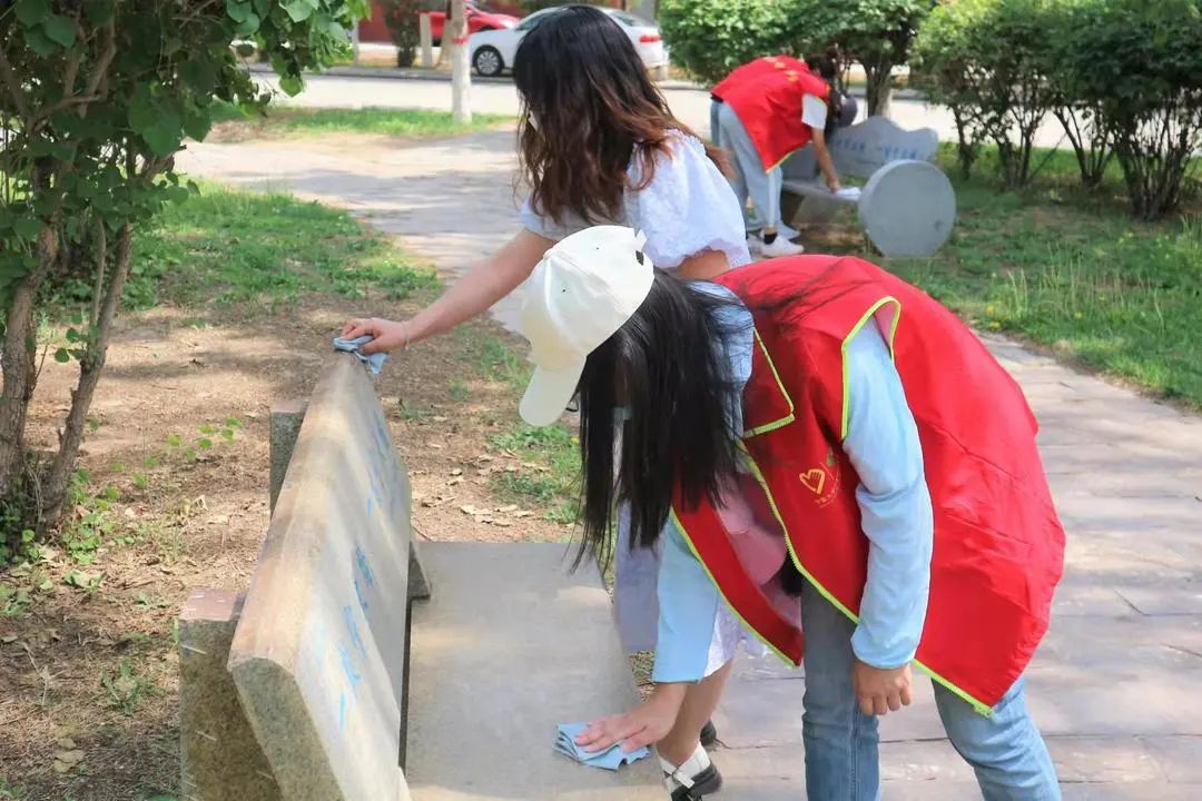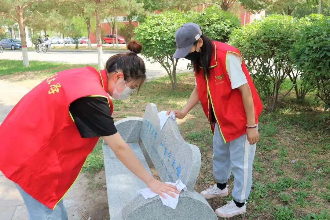 学员们三人一组,分工明确。负责擦宣传栏的同学拿着抹布和报纸,仔仔细细地擦拭每一个细节;另一边,由于刚刚下过雨,石椅上雨水混着灰尘,给擦石椅的同学们带来了不小的挑战;草地上,同学们尽其所能捡干净校园里偶尔散落的垃圾。正午的气温非常高,同学们虽然汗流浃背,但仍认真负责地完成各自的任务。
