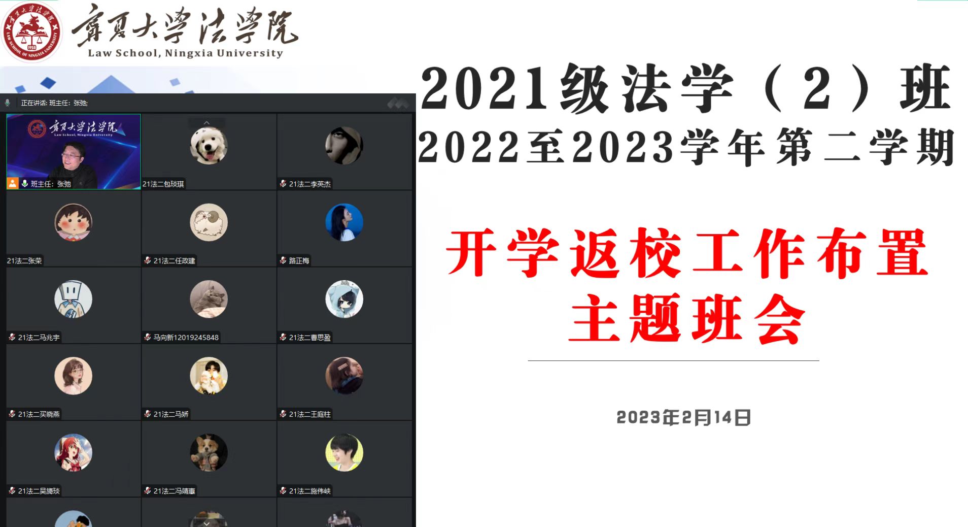 主题班会通过腾讯会议的形式,由本科生各班班主任主持召开。会上,各班班主任主要针对返校前健康监测、返校申请审批、错峰返校途中的安全事项、增强个人防护及疫情防控常态化形势下的日常管理等进行了安排部署。要求全体学生在返校前一周居家开展连续体温测量和新型冠状病毒感染相关症状观察等健康自测,另外提醒同学们合理安排寒假剩余时间,尽量减少外出,调整好自己的作息时间,做好返校准备。