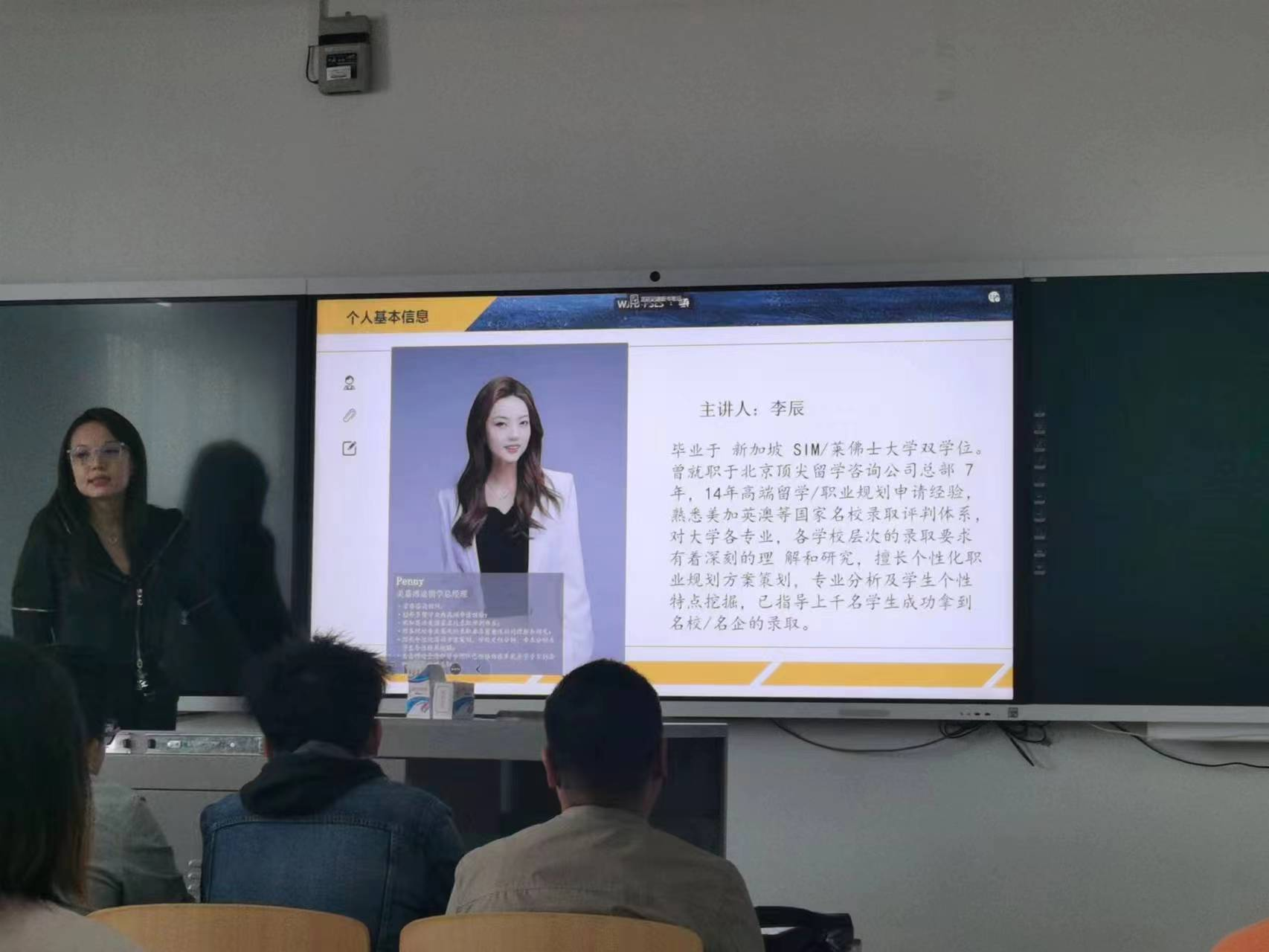李辰老师毕业于新加坡SIM/莱佛士大学,具有丰富的留学与职业规划申请经验。在分享会上,李老师主要就职业规划、出国留学、岗位应聘的基本流程作了讲解,并介绍了个性化职业规划方案、专业分析与出国留学之间的关系,接着向同学们阐明了留学前期准备、简历、网申、网测、面试各环节的注意事项,并就国外院校排名优势、宁夏政策优惠、出国花销性价比等方面解答了同学的疑问。