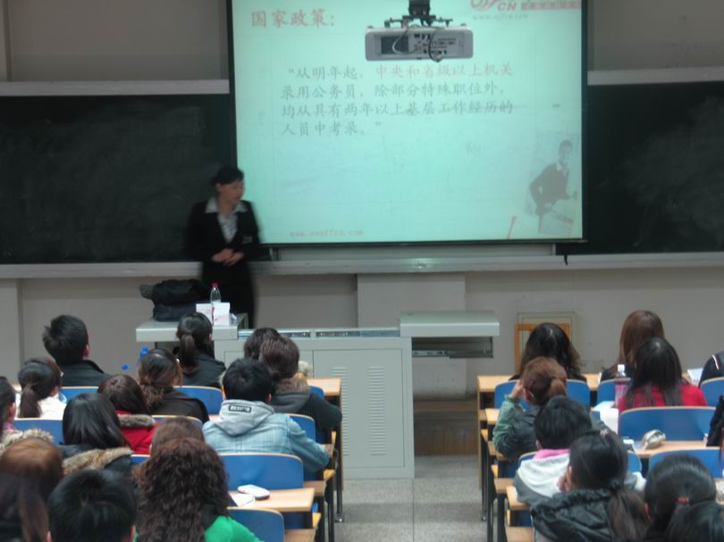 讲座中,李老师主要围绕“为什么考公务员、公务员考什么、用什么方式考”三个方面,多角度的分析介绍我国公务员招考的特点、要求及答题的方式方法。公务员考试,俗称“国考”,已成为当代大学生就业的首选,调差数据显示,国考的报名人数及录取比例在逐年增加并在2010年最终比例达到80:1。表明公务员已成为大学生就业的重要方向。李老师从“行测”和“审论”两方面分析国考实况,提出考生应具备七种能力:阅读理解能力、分析判断能力、提出和解决问题的能力、语言表达能力、文体写作能力、时事政治运用能力、行政管理能力。李老师分析指出申论具有形式灵活多样、背景资料涉及广、针对性强、并没有标准答案,“申论”的复习要有针对性,注重时政热点、党和政府的重要文献,和历年练习真题。最后,李雪老师总结到:广大考生应当正确对待公务员的工作性质,侧重自己能力的培养,要阅读、思考、反省。并希望这次讲座能为同学们今后的更好发展提供积极有益的指导。