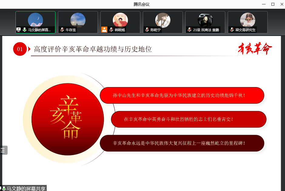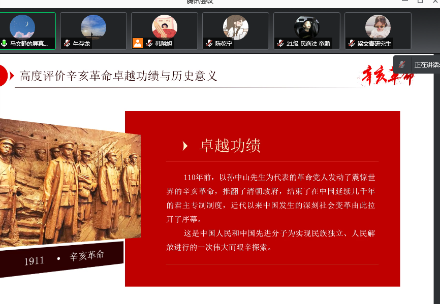 10月27日,法学研究生党支部组织开展党史学习教育理论学习研讨活动,支部集体学习了《习近平总书记在纪念辛亥革命110周年大会上的重要讲话》,各位党员同志围绕学习旧民主主义革命时期历史内容作了研讨发言、畅谈学习体会。新一期入党积极分子、党员发展对象分别围绕“探讨社会主义核心价值观,端正入党动机” “发展对象如何以实际行动,在学习、工作和生活中发挥先锋模范作用”进行了交流座谈。马文静同志围绕“习近平总书记在纪念辛亥革命110周年大会上的重要讲话精神”为支部党员讲授微党课。会议以线上方式进行,由支部书记黄博阳主持。