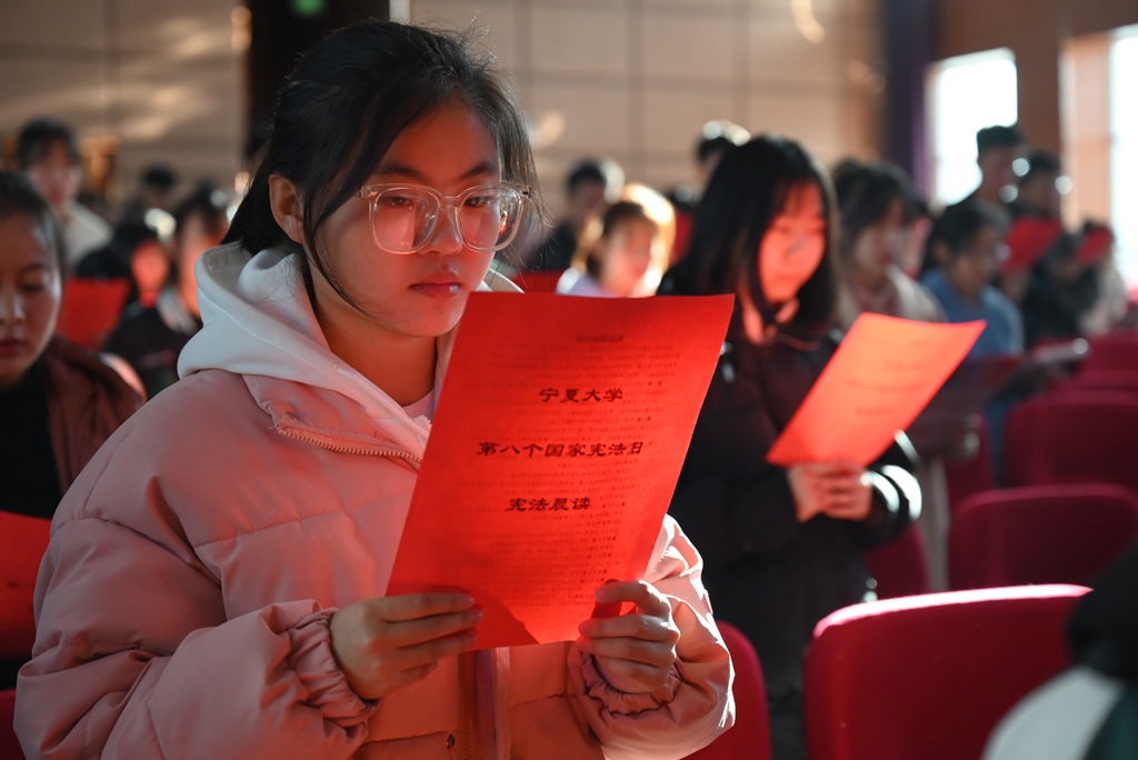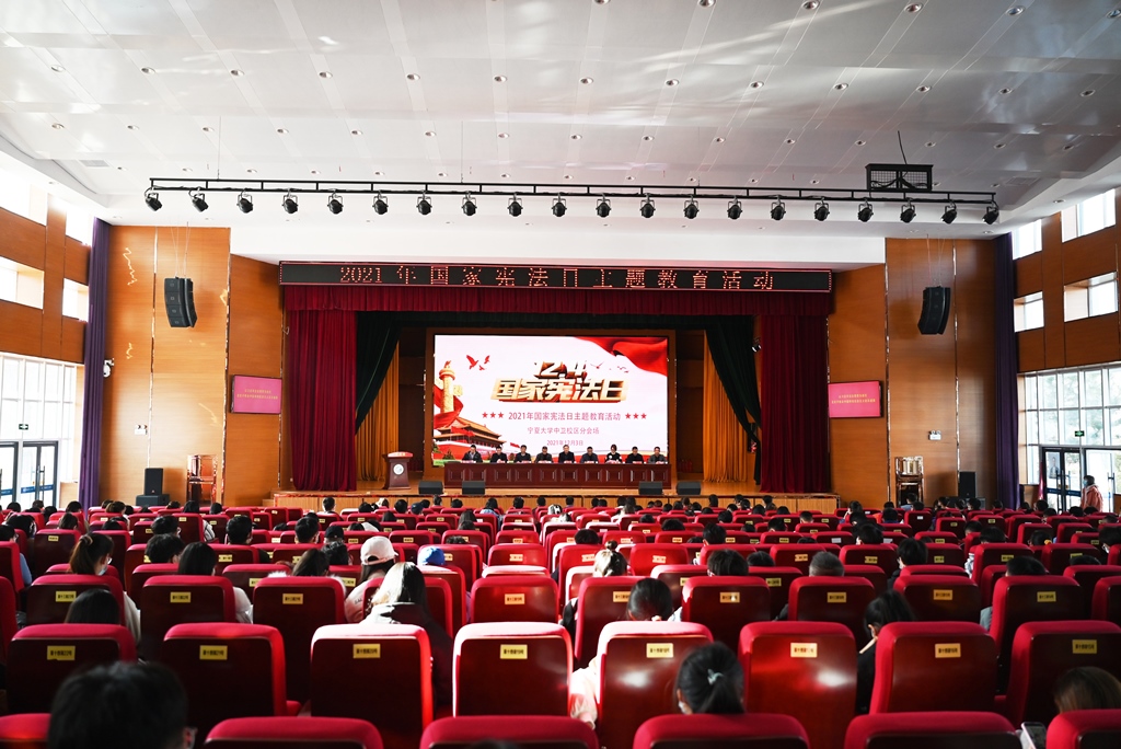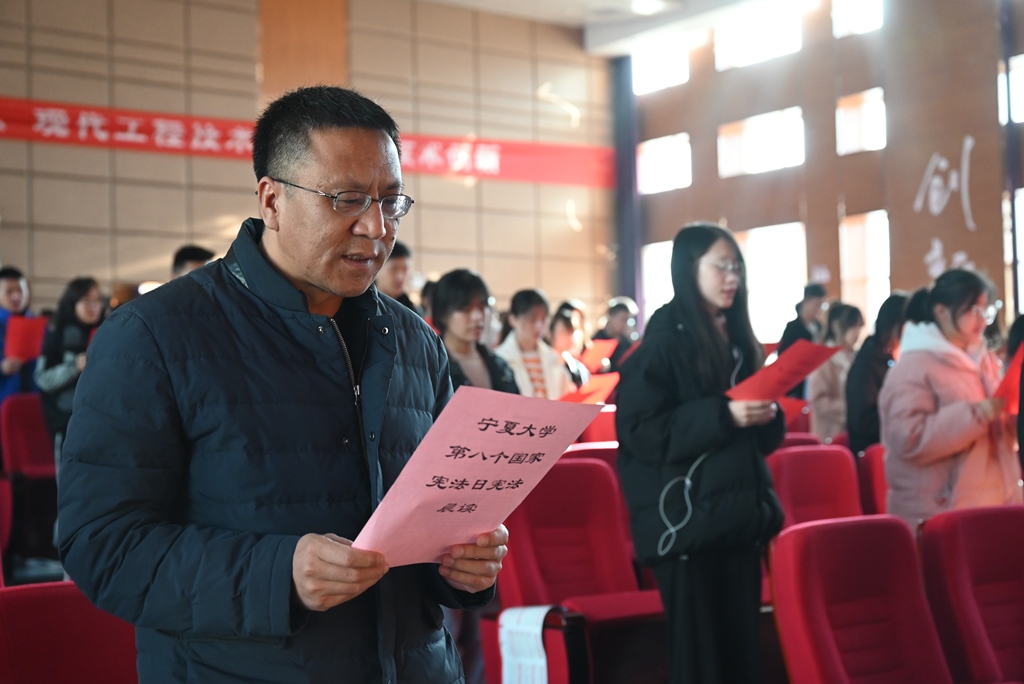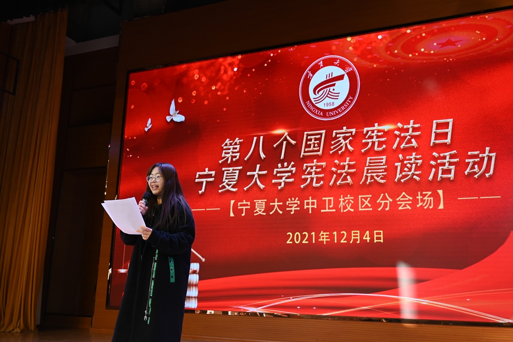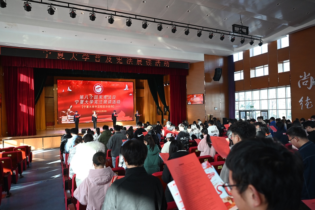 的三百余名师生在中卫校区应理报告厅齐声诵读宪法。师生们庄严而整齐的声音,铿锵有力,字字入心。