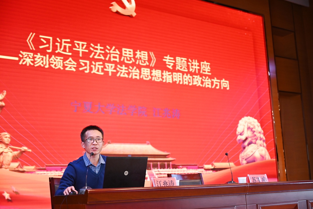 副教授江兆涛主讲。他以“十一个坚持”为主要内容,指出习近平法治思想以辩证唯物主义和历史唯物主义为重要基础,深刻回答了社会主义法治建设系列重大问题,为推进全面依法治国提供了基本遵循。要坚持习近平法治思想,深入推进全面依法治国,不断开创新时代法治中国建设新局面,为全面建设社会主义现代化国家、实现中华民族伟大复兴的中国梦而不懈奋斗。