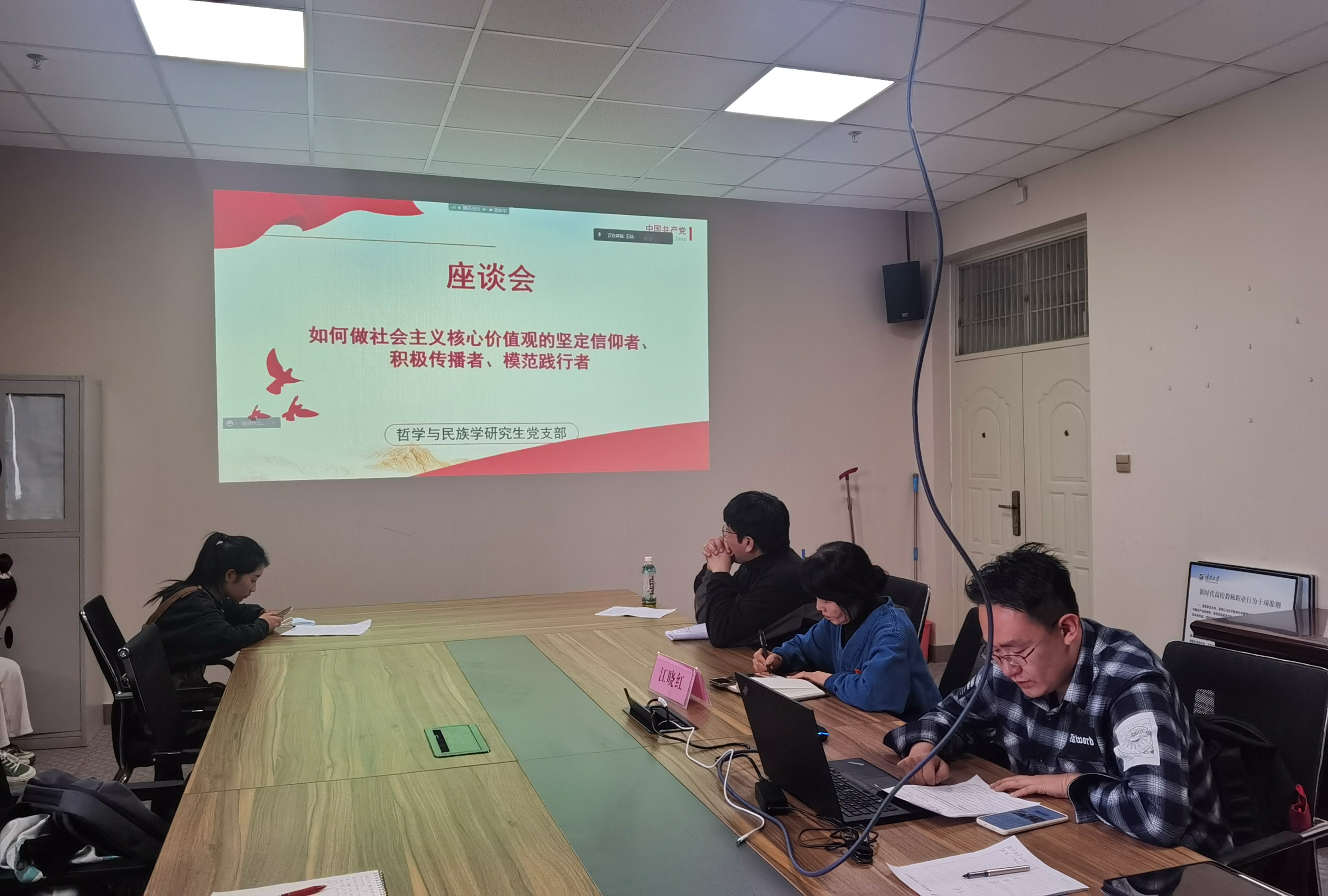 为不断加强支部入党积极分子和发展对象党性教育,引导支部党员、发展对象和入党积极分子进一步坚定理想信念,增强党支部的战斗堡垒作用,哲学与民族学研究生党支部于2022年4月20日下午3点在文荟楼806会议室,以线上线下相结合的方式,召开第四十一期入党积极分子、第十五期发展对象座谈会。
