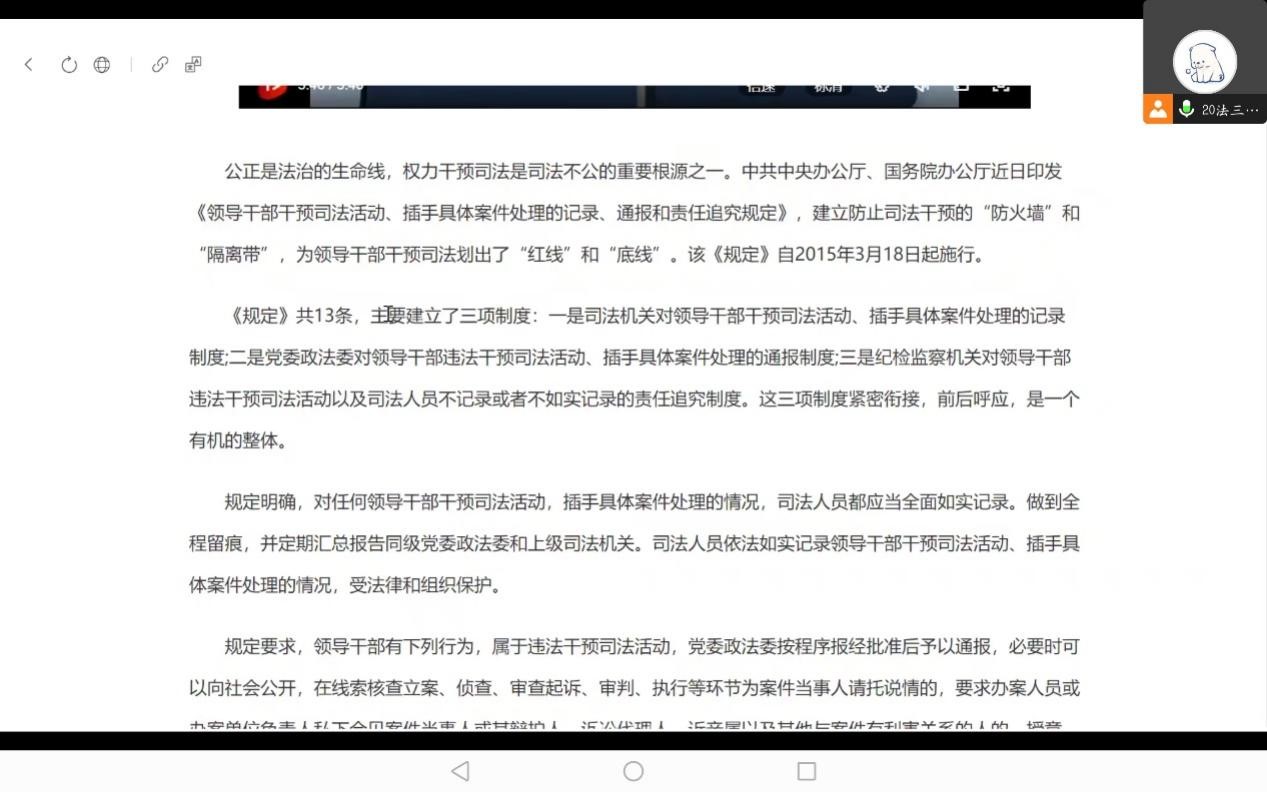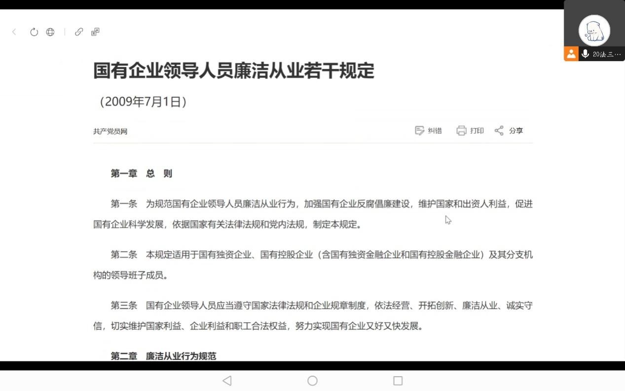 2023年4月6日,法律系本科生党支部于文荟楼801进行廉政专题教育学习,全体支部党员参加,其中2019级支部党员线上参会。学习内容为中共中央办公厅、国务院办公厅印发《领导干部干预司法活动、插手具体案件处理的记录、通报和责任追究规定》和《国有企业领导人员廉洁从业若干规定》。领学人为刘龙震同志,支部书记何磊与会总结。